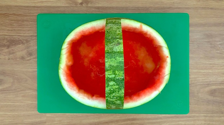 While a serrated knife makes this process infinitely easier, it can shred the watermelon too easily, defeating the purpose of a pretty presentation. Unfortunately, a chef's knife may not be sharp enough or small enough to navigate more complicated patterns. That said, I used one anyway. I started by cutting the base of my watermelon off to create a flat, stable base and then drew guidelines with a sharpie to indicate where to cut the handle and bottom of the basket.