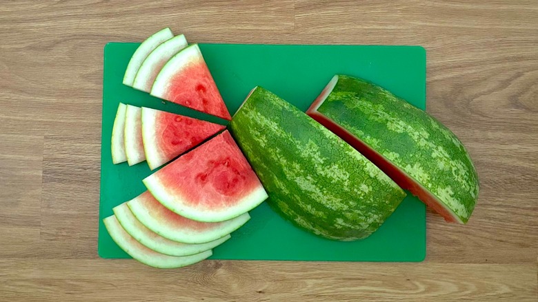 Before you begin cutting a watermelon, there are a few things to keep in mind. First, it can be helpful to know how to pick the perfect watermelon. Among the things to consider are its color, density, and any imperfections to its rind. Once you select the watermelon and get it home, wash it thoroughly to avoid the spread of bacteria into the melon as you cut it — and be sure to dry it with a clean paper towel to prevent slippage.