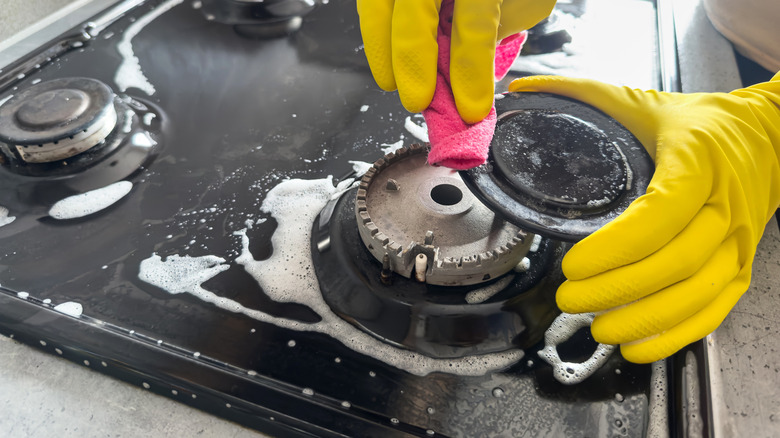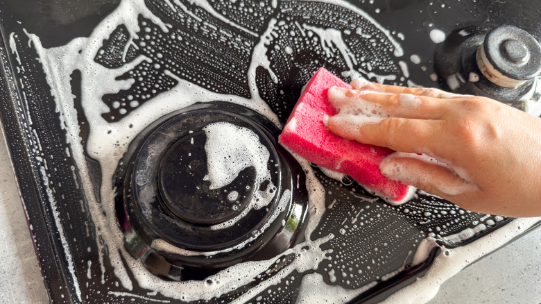 Next, apply a store-bought cleaner that's safe for gas stovetops — such as Weiman gas range cleaner and degreaser (following the manufacturer's instructions) — or make a cleaning solution of your own. If there isn't a lot of grease and grime to remove, use a soft cloth or sponge to lather up a combination of warm water and dish soap. Let the solution sit on the stovetop for about five minutes before you scrub it away. Always use something nonabrasive to scrub with to avoid scratching the surface.