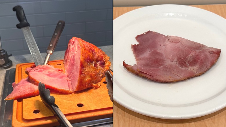 The ham is probably the fanciest looking station of them all, with its wood cutting board, large knives, and heat lamp. While the setup was top-notch, the ham wasn't.