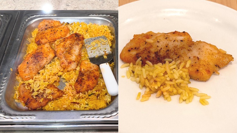 I also loved the rice this piece of fish came with. It was flavorful, fluffy, and reminded me of paella. The fish was flakey with a light coating of spices, too. While you could enjoy the flavors of both the fish and spices, neither were overpowering or trying to cover up anything fishy — honestly, the baked fish offered a great bite every time. Think salt, pepper, and a little something extra thanks to that rice. Try them as a pair as advertised, and you won't be disappointed.