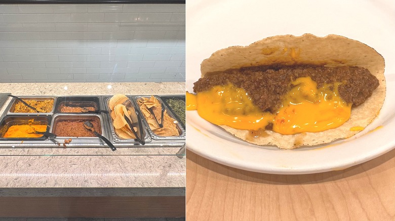 For this buffet item, you have the option of ground beef, nacho cheese, rice, and beans. We opted for the taco shell over the chips, some beans, meat, and cheese. I know it's not good for you, but man — do I love the occasional nacho cheese. Looking back, I'm honestly shocked we didn't make nachos.