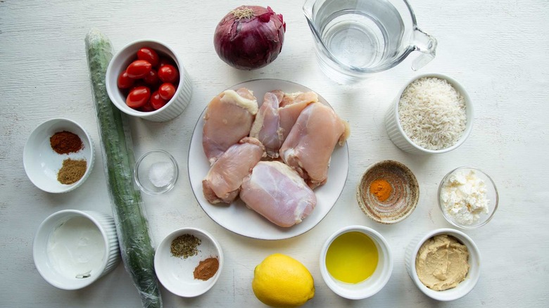 For this recipe, you'll need full-fat plain Greek yogurt, lemon juice, salt, cumin, paprika, cinnamon, and oregano. Next, get boneless, skinless chicken thighs, long-grain white rice, water, and turmeric. Finally, get grape tomatoes (halved), diced cucumbers, diced red onion, olive oil, hummus, and crumbled feta.