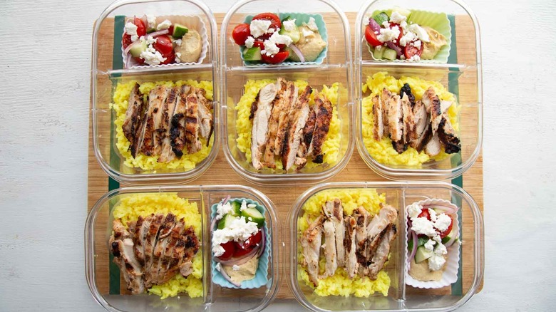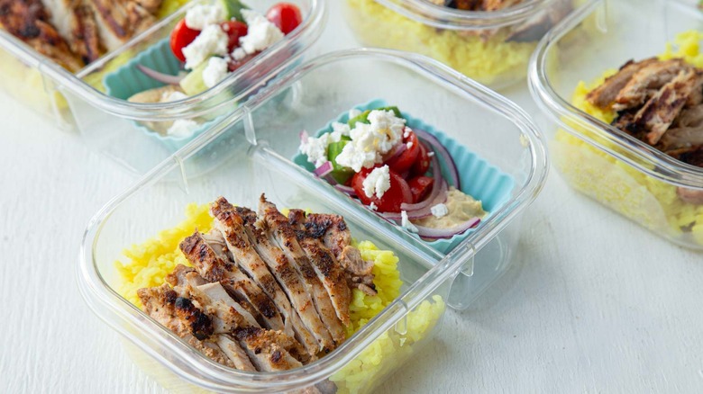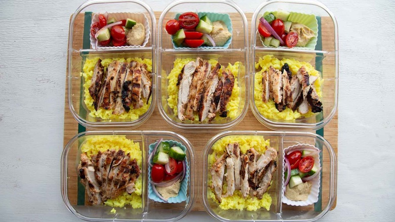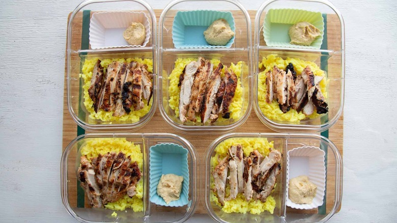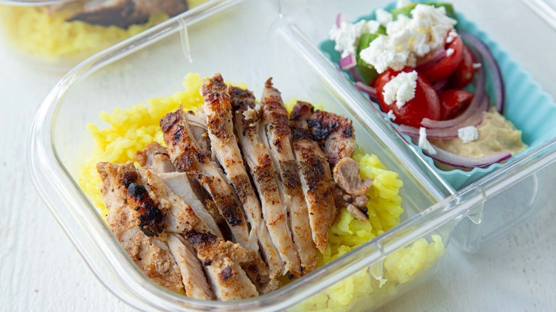 This meal prep-friendly chicken shawarma, courtesy of Daily Meal recipe developer Kate Shungu, layers on all of the sharp, strong flavors and contrasting textures you love in a classic shawarma sandwich in convenient packed-lunch form. Grilled chicken that has been marinated in a zesty, earthy, herby, piquant sauce of Greek yogurt, cumin, cinnamon, oregano, and lemon is combined with a bright, fresh tomato, onion, and cucumber salad, tangy, briny feta, garlicky hummus, and turmeric rice. "I love getting ahead for the week, and this simple recipe will leave you with five ready-to-go lunches in just 40 minutes," Shungu explains, "It's the perfect mix of protein, carbs, and veggies to fuel your afternoon, with lots of flavor to boot." No sad desk lunches to be seen around here!