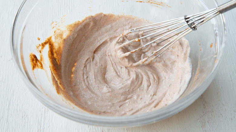 - In a large bowl, whisk together the Greek yogurt, 2 tablespoons lemon juice, 1¼ teaspoons salt, cumin, paprika, cinnamon, and oregano.
