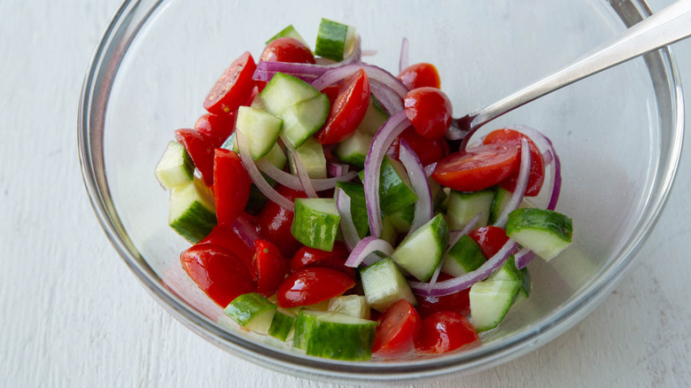 - In a medium bowl, toss together the tomatoes, cucumbers, red onion, olive oil, and remaining 2 tablespoons lemon juice.