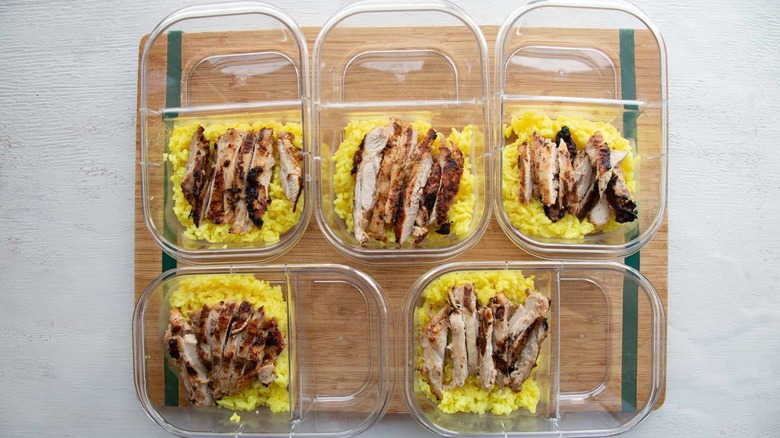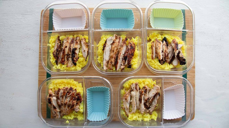 This meal prep chicken shawarma recipe is a great jumping-off point for experimentation. To start, if your spice cabinet isn't usually stocked with all the herbs and spices called for here, Shungu recommends using a premade shawarma seasoning blend. Meanwhile, if you prefer white meat, she suggests, "use chicken breasts instead of chicken thighs." Folks with dairy sensitivities can use a lactose-free Greek yogurt — Shungu recommends Fage Best Self. White rice is a great base for the turmeric seasoning, but if you want to switch it up, Shungu tells us, "sub brown rice for the white rice (the cooking time will be longer) or even use a microwaveable rice pouch to cut down on the cooking time."
