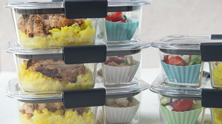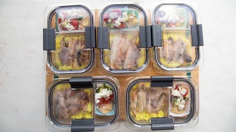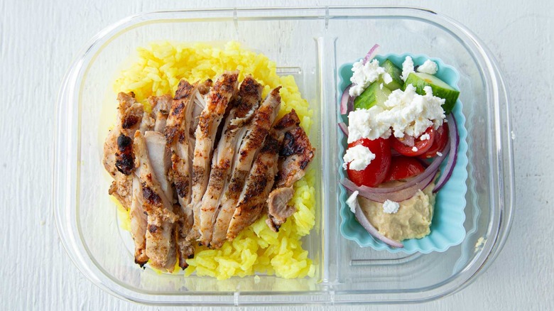 Meanwhile, the side tomato and cucumber salad can be swapped for lettuce or mixed greens, though to prevent the leaves from wilting, you'll want to pour in the dressing only once you're ready to eat. Finally, if you like this framework but want to try out a different vibe from week to week, Shungu suggests, "Change up the flavors entirely with a burrito-bowl style meal, using taco seasoning for the chicken, and storing pico de gallo and sour cream in the little cup on the side."