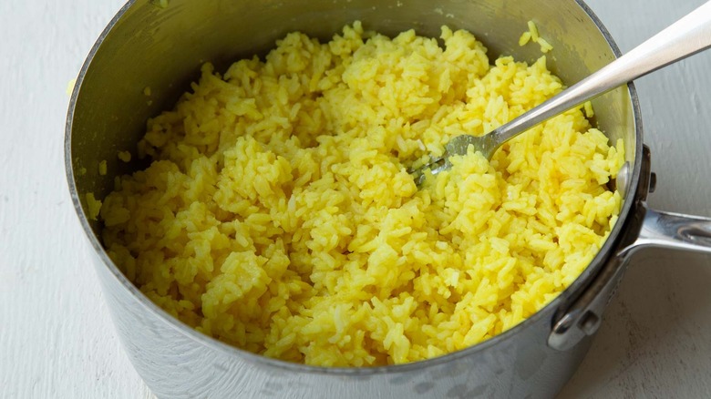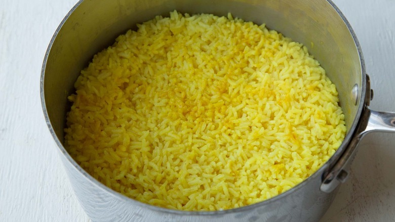 - Place the rice, water, turmeric, and remaining ½ teaspoon salt in a saucepan over high heat. Bring to a boil.