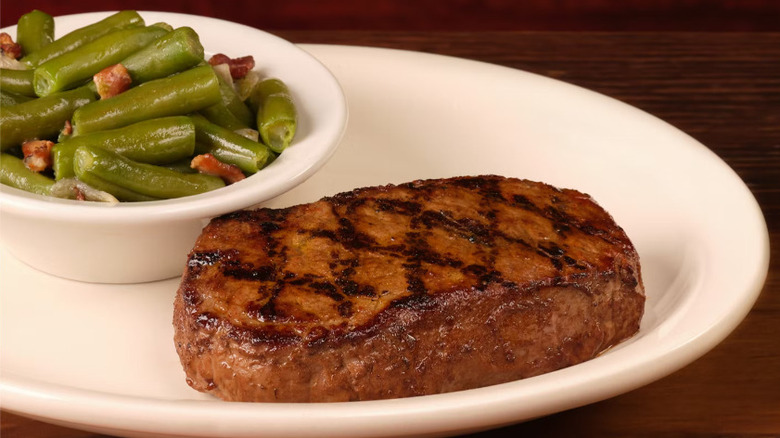 If you opt for garlic butter, my personal pairing suggestion is to go with the mashed potatoes and green beans. The mashed potatoes will add a nice creamy contrast to the rich steak, while the green beans are already seasoned with garlic — thus, making them the perfect side. When these are paired with Texas Roadhouse rolls smeared with honey cinnamon butter, you have a filling, awe-inspiring meal. It's amazing what a difference switching out the steak's finishing butter can make!