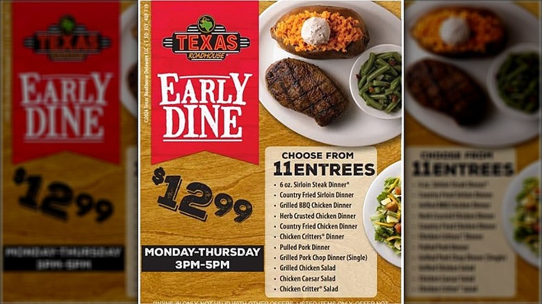 Hack your way to cost savings by taking advantage of the early dine-in special at Texas Roadhouse, which is available Monday through Thursday from 3 pm to 5 pm at some locations. But the one catch is that you must dine-in, and you can't use it with to-go orders.