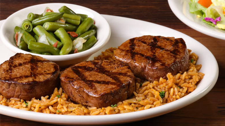 Instead of ordering the standard filet, order the filet medallions. You'll get three 3-ounce pieces that total 9 ounces of meat for $23.99. Included is a choice of either peppercorn sauce or portobello mushroom sauce, and the meal is served over a bed of seasoned rice. It also comes with one extra side.