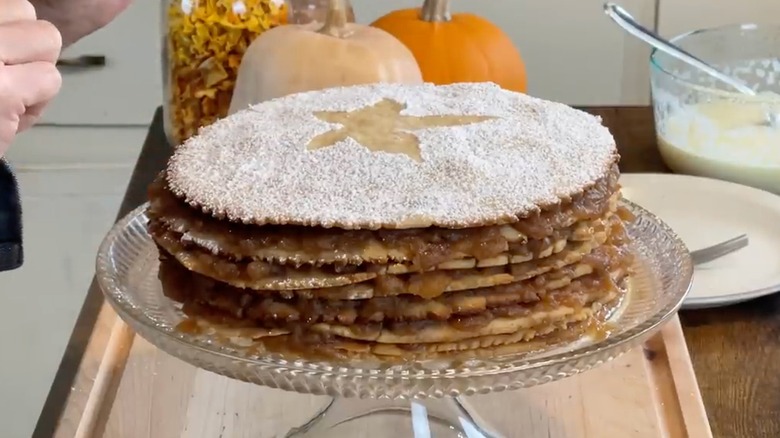 To the uninitiated eye, an apple stack cake may very well resemble a stack of pancakes piled high and spread with dense layers of apple compote. While this isn't altogether inaccurate, it is also very simplistic. At its heart, apple stack cake is formed from layers of cake made with flour, eggs, and buttermilk, sweetened with the unique flavor of sorghum molasses. These are alternated with a paste or sauce made from chopped apples cooked together with sugar or molasses, spices, and water until thick and gooey.