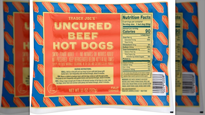 The packaging also clarifies that there are no added nitrates or nitrites in these sausages. Nitrates occur naturally in salt and cultured celery powder, but they don't come from any other sources in Trader Joe's dogs. The National Institute of Health explains that nitrates are converted into nitrite in some environments, including the human body, but they're safe to consume up to the recommended limit. This aligns with some myths about hot dogs being generally unhealthy, as this depends on the amount a person consumes over a period of time.