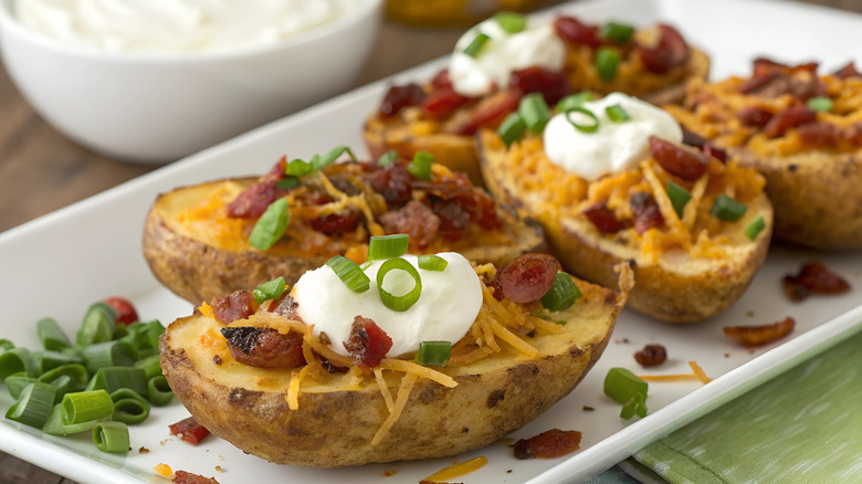 By all accounts, loaded potato skins should be gone by now. The invention of this appetizer is disputed, but it started to appear around the early to mid-1970s, with restaurants like TGI Fridays placing them on their menu. Pretty soon, the popularity of potato skins exploded. By the '80s they were everywhere, with people falling in love rapidly with the combination of a handheld potato piece and all of the toppings you could dare to dream of.