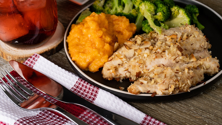 Chicken almondine is one of those dishes that just feels old-school. This chicken dish seems like it was flown straight out of the 1970s, those decades where food culture tended to try and make things fancy while somehow keeping them fairly unsophisticated. A bygone dish, chicken almondine combines (as you might expect from its name) poultry and almonds. Chicken tenderloins are coated with flour and Herbes de Provence, before being cooked in butter, white wine, and chicken broth. They're then topped with buttery, toasted almonds, which give the tenderloins a nutty crunch. Kinda weird, but hey, we'll take it.