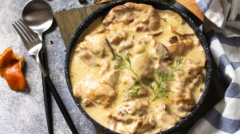 Chicken fricassee is one of those dishes that's been around for hundreds of years, but only started appearing on restaurant menus relatively recently — before disappearing once more. A fricassee is a French style of cooking that involves simmering meat in a thick, white sauce spiked with aromatics, stock, and vegetables. Chicken fricassee has likely been around since the Middle Ages, and like many other braised or stewed dishes was favored by people for its heartiness and ability to use up a host of readily-available ingredients.