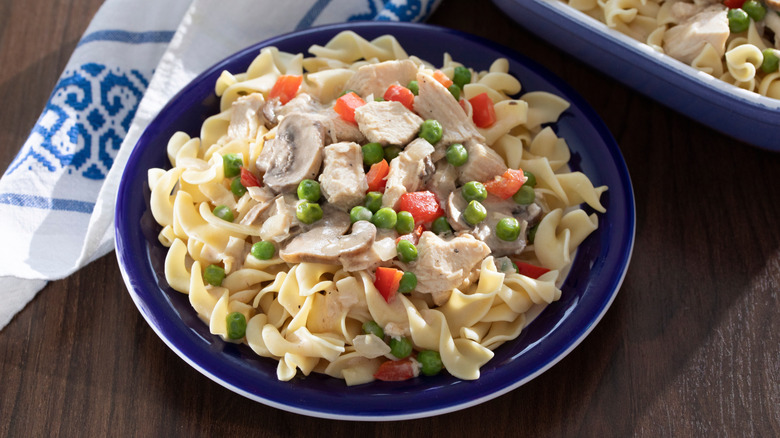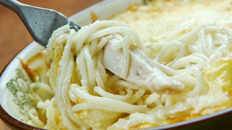 The point, though, is that it used to be the kind of dish that felt like a special treat to order, thanks to its creamy combo of chicken, cheese, sauce, and spaghetti. However, over time, the shine dulled on this meal. Chicken tetrazzini quickly became a one-stop shop for whatever home cooks had sitting in their fridge, and its early fanciness disappeared.