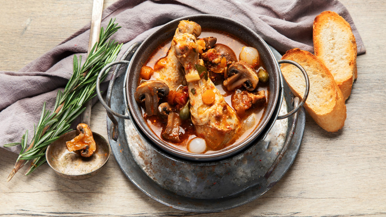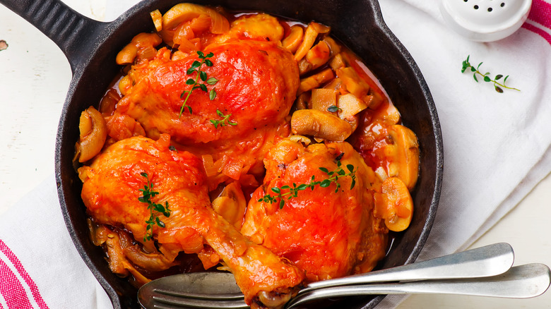 We personally think it's a shame that chicken cacciatore isn't more popular than it is on restaurant menus these days. This classic Italian dish, which literally translates to "hunter's chicken," has been around for hundreds of years. Like many older dishes from European countries, it's a stewed affair, with the poultry simmered with tomatoes, onions, red wine, and various aromatics.