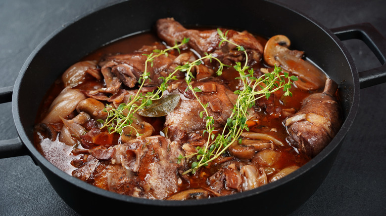 It's a shame, too, as coq au vin is undeniably delicious and has a long lineage. This dish only started being formalized in cookbooks around the 19th century, but it's thought to have been made for hundreds or even thousands of years before this, and is just one of a long line of braised stews that were popular amongst peasants and individuals living in the countryside. Its combo of chicken, wine, and root vegetables gives it a rustic feel and a surprising amount of complexity. It's just a shame that rustic sense doesn't translate well to today's food culture.