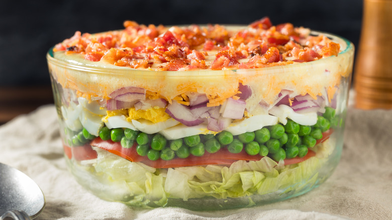 Though people may disagree on the precise ingredients, many recall family gatherings where this dish was served by grandma or a favorite aunt with nostalgia, like one Reddit commenter who mentions, "This is an old recipe my family makes for every holiday." Typical ingredients include iceberg lettuce, Cheddar cheese, cooked bacon, hard-boiled eggs, tomatoes, green peas, and scallions. These are layered in a trifle dish and topped with a mayonnaise-based dressing. This salad can be served immediately or allowed to marinate overnight in the refrigerator. While some recipes call for combining the ingredients ahead of time, purists balk at this, claiming that the only right way to serve the dish is for each ingredient to be visible in a distinctive layer.