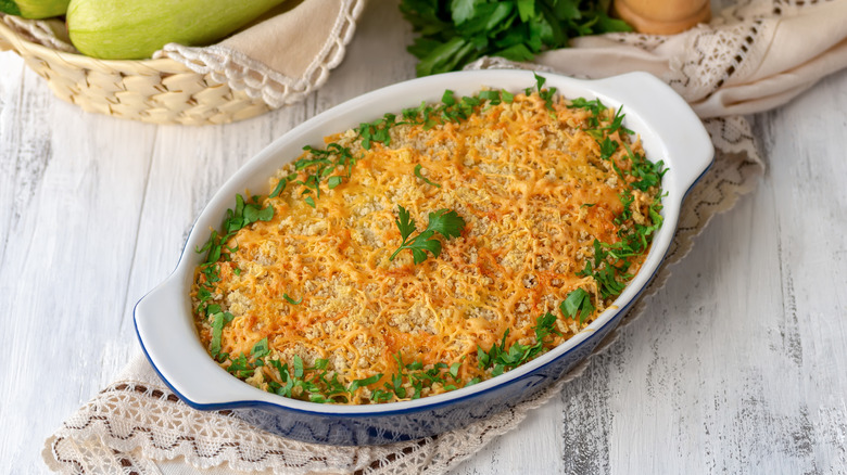 There are plenty of old-timey squash casserole recipes out there, with some being hand-written by someone's grandmother on a yellowed index card and written in an almost indecipherable code of cryptic measurements. Most of these recipes feature yellow squash, though any type of summer squash variety will suffice. The cooked squash is combined with breathtaking amounts of sour cream, cheese, and mayonnaise before being layered into a casserole dish and garnished with a buttery cracker topping. As the dish bakes, the squash absorbs all of that delicious flavor, yielding an almost soufflé-like texture.