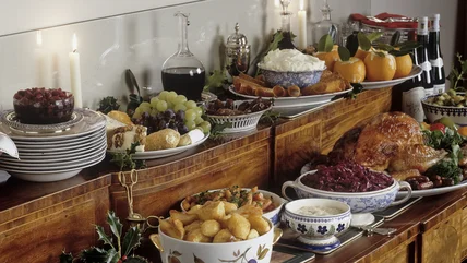 Home buffets often serve food in cooking vessels beautiful enough to be considered part of the room's décor. But this isn't always practical, either. You may see rotisserie chicken on a home buffet, but you're unlikely to see a cooking spit mounted on a buffet table.