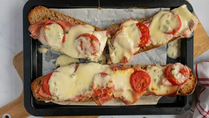 This open-face sandwich, which was created by two university professors, Marv and Joe, features layers of sliced tomato, provolone and parmesan cheese, olive oil, and balsamic vinegar before being broiled to perfection. While the tomato still provides a burst of freshness, this sandwich adds an irresistible contrast of the gooey, melted cheese with the bread's crispy edges. The mix of cheeses brings a depth of flavor, while the garlic butter slathered on the bread gives each bite a savory kick.