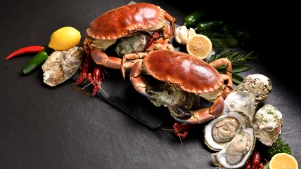 Different types of crab come from different locations and thus have different peak seasons. Autumn, though, is the season for Maryland blue crab. Blue crab gets its name from its blue to olive green shell (that turns orange when cooked). This crustacean is fairly small (especially compared to king crab) as it can be harvested when it's around 5 inches in width. Seafood lovers are especially fond of blue crab because the meat is sweet and buttery.