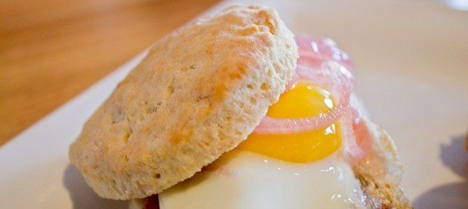 The belly sandwich starts with a salty, buttery biscuit (with a consistency that crumbles more like a scone than a traditional Southern-style biscuit) thats split and toasted. Next comes the pork belly, which maintains a bite to it instead of falling apart completely. The flavor of the meat is sweet and spicy, with a glaze similar to that of barbecued ribs. The belly is topped with a sunny side egg, cooked so that the edges of the whites are crisp-fried, and the yolk is still rich and runny. House-pickled red onions are the final addition to the sandwich, which lend a needed fresh tanginess to the otherwise heavy components at play.