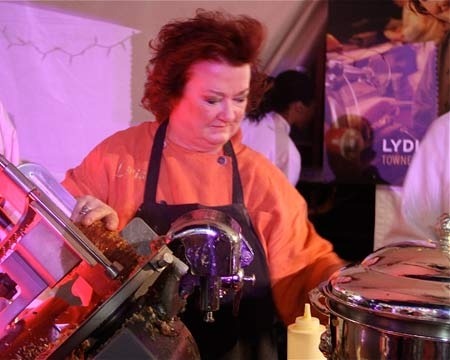 Jonathan Waxman said he thinks the kind of food his friend Floyd Cardoz is cooking is the way things are heading. Floyd, for his part, smiled and said after being asked what he thought about the rise of the celebrity chef, and walking the red carpet in L.A., "I'm just a damn cook, man!" He wouldn't give precise details on his new Danny Meyer restaurant North End Grill, but said it would be an homage to grilling. And was that Roy Choi talking about a new restaurant with a Caribbean feel? (At left, chef Lydia Shire slices porchetta at the red carpet kickoff)