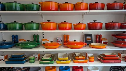 Red is a bold color choice for cookware that inherently makes a statement. Since red commonly appears in color palettes for holidays with feasts, it's also a safe choice that will just about always belong on a dinner table.