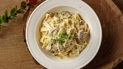 Chicken Alfredo is classically made with fettuccine noodles because their flat and wide shape provides plenty of surface area for the cream sauce to cling to. However, when making a baked version, smaller pasta shapes, such as rotini, penne, or conchiglie, are a better choice because they soften quickly and can be scooped out of the dish easily for family-style service.