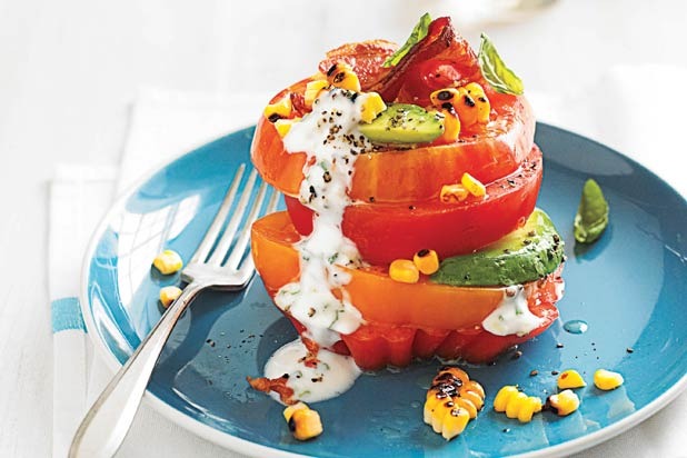 Corn, avocado, and tomatoes — three ingredients that scream summer at us. This recipe stacks them all together for a light and easy summertime salad. A creamy buttermilk dressing and flecks of bacon make it a satisfying dish that could easily be enjoyed all on its own.
