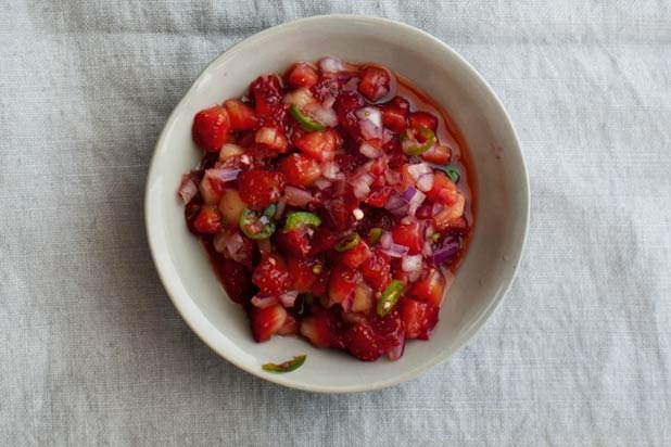 Another recipe from True Food, this medium-hot summertime salsa is perfect when enjoyed with raw vegetables, chips, or even all on its own. Also a great summer sauce for your grilled fish or chicken, the salsa can be flexible with whatever berries you have on hand. The authors suggest swapping in raspberries if fresh strawberries are not available.