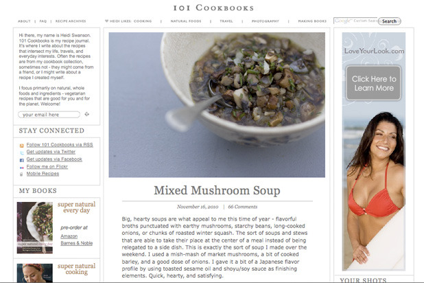 Heidi Swanson blogs about her meals, interests, and travels at 101 Cookbooks. Most of the recipes are vegetarian and either come from cookbooks or were created by Swanson.