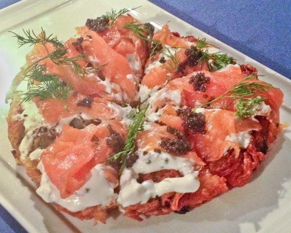 Kutsher's Tribeca served a Peking duck-topped offering; Veselka's was topped with braised pork and cherry compote; Mile End served a butternut squash latke with fresh sage; Commerce served a classy scallion latke with farmer's cheese, smoked salmon, and caviar (pictured); The Plaza Hotel served a duck fat-fried latke with duck confit; Delicatessen's sweet potato latke was topped with a slider made from ground brisket; Stone Park's was filled with braised short rib and topped with smoked crème fraîche and sour cherry compote; Toloache served a yucca latke with salmon pastrami; and The Butterfly served a latke topped with sliced prime rib, caramelized onions, and horseradish cream. To top is off, Dough was on hand, giving away donuts filled with either strawberry jam or passion fruit cream.