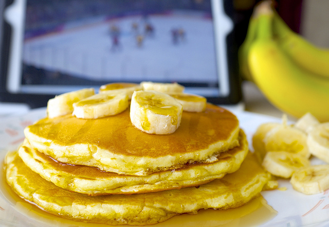 Banana Pancakes. What's your favorite way to top super-starchy pancakes studded with carbohydrate-loaded bananas? More carbs (like maple syrup)? Us too.