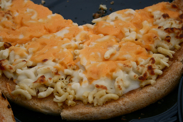 Macaroni and Cheese Pizza. The person who decided to take a slice of pizza, top it with gooey macaroni and cheese, and bake it in the oven until golden brown and delicious, might just be a genius.