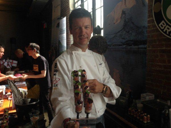 Upon entering the hall in the brewery, we made a beeline for Chef Bart Vandaele of Belga Café and B Too in Washington, D.C. The warm and convivial chef was obviously having a blast interacting with the crowd as he detailed the beautiful dish he had made for the event: bite-sized pieces of raw, kelp-marinated Norwegian salmon belly lay atop a layer of thick and tangy yogurt with oyster sauce, all garnished by a sweet and juicy blackberry. The dish was cleverly plated, in that no plate was involved – Vandaele and his team loaded them into clear push-pop-like apparatuses, which made the snack fun and, most importantly when considering the venue, portable.
