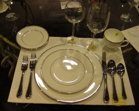 In general, forks go to the left of your dinner plate and knives and spoons go to the right. The knife blades should always face toward the plate. Remember this by imagining that the knives are protecting the spoons from the evil forks to the left. Wondering what fork is what? Click here to learn more.