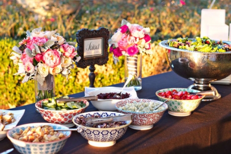Choose a venue that doesn't require you to use their caterers (ex: a park, a backyard, an art gallery, etc.). This way you can customize food choices and bargain with vendors. At our wedding, we served small plates by way of self-serve stations. Each station had a different theme and, therefore, a different caterer. This allowed us to hand pick our food and our prices.