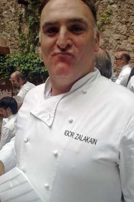 Hotel Empordà in Figueres, 20 miles or so south of the French border in Catalan Spain, late in the afternoon last Monday, I found a veritable culinary constellation sipping white wine and gin-and-tonics in the lounge: Ferran Adrià, Joan Roca, Carme Ruscalleda, and Elena Arzak, whose restaurants — El Bulli, El Celler de Can Roca, San Pau, and Arzak, respectively — each have three Michelin stars. Also present were the irrepressible José Andrés (left, in a jacket borrowed from a chef at Arzak); the American TV and film producer Jeff Kleeman ("Friends With Benefits"), who is plotting a film based around Adrià's soon-to-close El Bulli; and the man everybody, myself included, had come to honor: Jaume Subiròs, chef, restaurateur, and hotelier, whose landmark establishment, El Motel — which is the hotel's dining room— is celebrating its 50th anniversary this month.