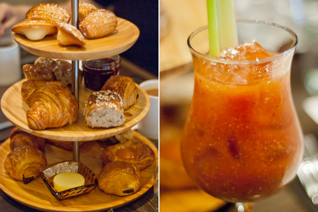 The tiered pastries come with croissants (with and without chocolate), multigrain bread, and madeleines, plus butter and jams to spread. The Bloody Mary is thick and not too spicy.