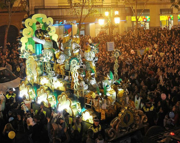 Every year on January 5, towns and cities all over Spain hold Epiphany parades where the Three Wise Men parade through on their way to deliver gifts to the baby Jesus. It's a popular attraction, because on the way to the gift giving, Balthazar, Melchior, and Gaspar throw handfuls of candy to the other children they pass along the way.