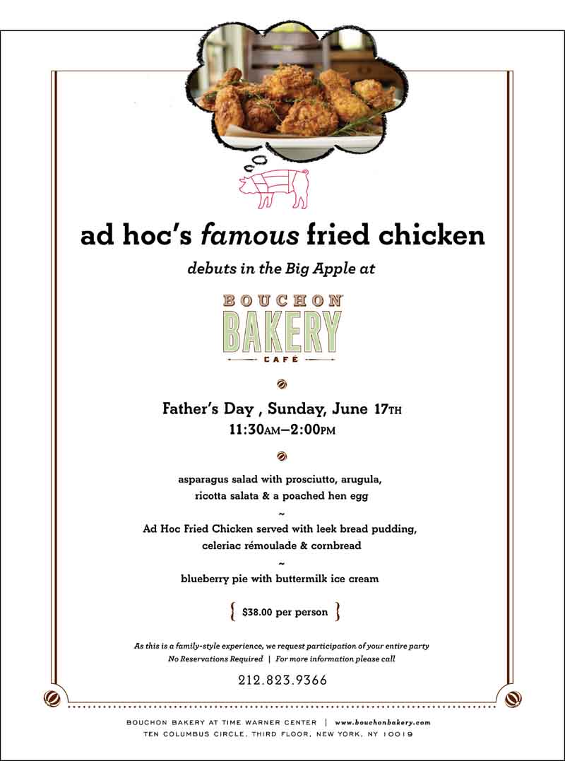 New Yorkers, however, may get a taste this Sunday, when Bouchon Bakery at Time Warner Center serves up their Father's Day brunch. For one day, the buttermilk fried chicken will be served in a $38-per-person prix fixe menu.
