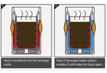 So we're especially pumped to see a new coffee mug design that reheats itself — without electricity. Mashable found designer Ryan Jongwoo Choi's Burning Cup design, which uses a key ingredient to reheat without power. The answer: sodium acetate, a compound that's solid when cold, and liquid when hot. The hot coffee inside the cup heats up the sodium acetate, and when the drinker feels like the coffee's getting cold, he can push a button that activates the sodium acetate to act as a warmer.