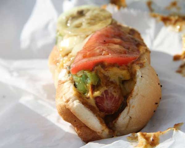 Katz's Deli, on New York's Lower East Side, is a New York institution. And it just so happens that the hot dogs here are very good. Made especially for the restaurant by Sabrett, these garlicky, natural-casing, jumbo-size all-beef dogs spend such a long time on the flat-top grill that the outside gets a nice char and snaps when you bite into it. A smear of mustard is all that's needed, but a little sauerkraut or stewed onions certainly won't hurt.