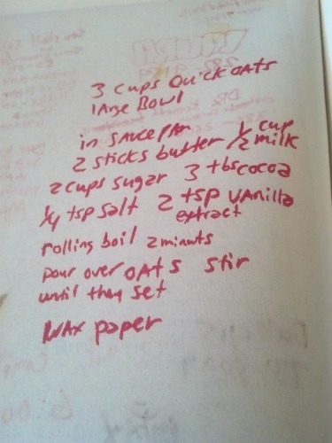 Laura of Eating the Beats stumbled across two recipes in Kurt Cobain's journals — no-bake cookies and his mother's shrimp pasta salad (Note: Where is the shrimp in the recipe?). Laura's verdict on the "insanely sticky" cookies: "They were really good! Tasted like any other no-bakes, except without the peanut butter." She suggests leaving them overnight in the fridge.