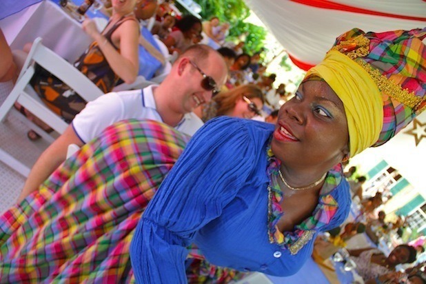 1:40 PM Chefs Tim Love and Peter Edey did demos with Nilou. Love did steak a la plancha and on the grill with campbread. His son came up to help. He busted out the white wine again. Edey did flying fish on the plancha wrapped with barbeque sauce in a banana leaf, and served it with cou cou and vegetables. It's noted this is the dish you have to eat before leaving the island. A tall, thin man dressed as Uncle Sam entered the pavillion with a woman wearing a Caribbean dress. They danced to the sound of a motley band of period costumed musicians. Much booty-shaking ensued. Like serious, booty-slapping. Interviewed Chef Love after the demo.
